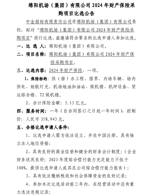 綿陽機場(集團)有限公司2024年財產保險采購項目比選公告