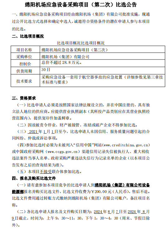綿陽機場應急設(shè)備采購項目(第二次)比選公告