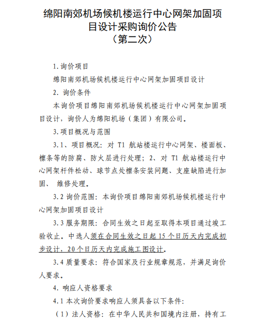 綿陽南郊機場候機樓運行中心網架加固項目設計采購詢價公告(第二次)