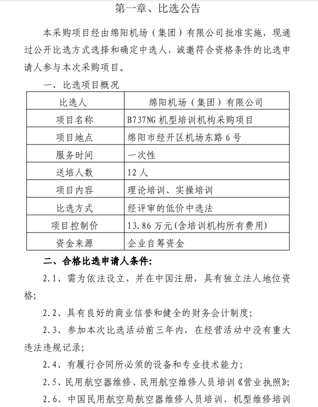 綿陽機(jī)場(chǎng)B737NG機(jī)型培訓(xùn)機(jī)構(gòu)采購(gòu)項(xiàng)目比選公告