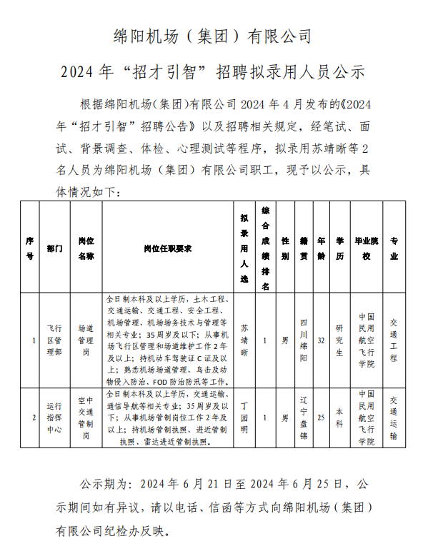 綿陽機場(集團)有限公司 2024 年“招才引智”招聘擬錄用人員公示